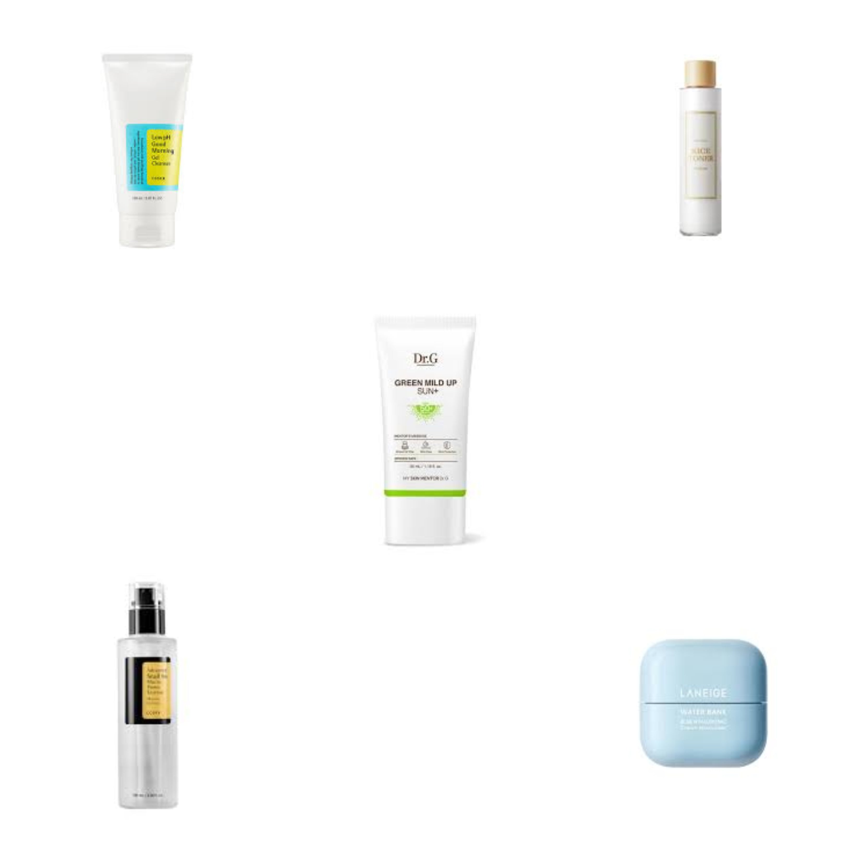 Transform your skincare routine with our Korean treatment specifically designed for sensitive skin in the 50's. [Cosrx] Low pH Good Morning Gel Cleanser removes impurities while maintaining skin's natural pH balance. [ImFrom] Rice Toner hydrates and brightens. [Cosrx] Advanced Snail 96 Mucin Power Essence boosts collagen production. [Laneige] Water Bank Blue Hyaluronic Cream replenishes moisture. [Dr.G] Green Mild Up Sun provides SPF 50+ protection.