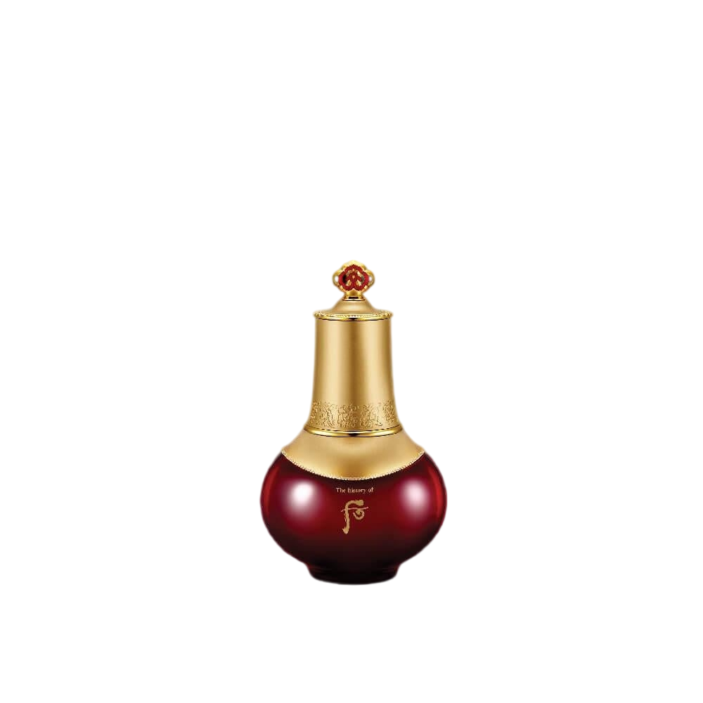 Intensive revitalizing essence enriched with red ginseng extract prepared using GuJungGuPo technique (9 times steaming and sun drying) delivering deep nutrients for hydration, revitalization, and collagen synthesis improvement. Features red ginseng miracle ingredient enhancing blood circulation within skin to strengthen moisture retaining ability making skin appear plump, smooth, and dewy. Contains comprehensive anti-aging benefits with post-toner application using fingertip gentle tapping motion on forehead, nose, chin with hand wrapping for enhanced deep absorption and skin elasticity improvement.