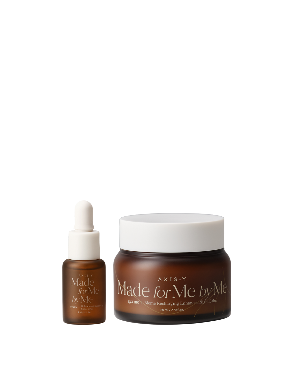 AXIS-Y Biome Recharging Night Renewal Set The "Plumping Creamy Balm Texture" of the night balm and the "Silky Magnet Drop Texture" of the 10 Panthenol Concentrate work together to deeply nourish and hydrate from within, supporting a healthy moisture balance for radiant and revitalized skin. -AXIS-Y Biome Recharging Enhanced Night Balm "Plumping Creamy Balm’ texture forms a smooth protective layer, providing radiant and glossy skin" -AXIS-Y 10 Panthenol Supporting Concentrate "Silky Magnet Drop’ texture boosts absorption and efficacy of subsequent products"