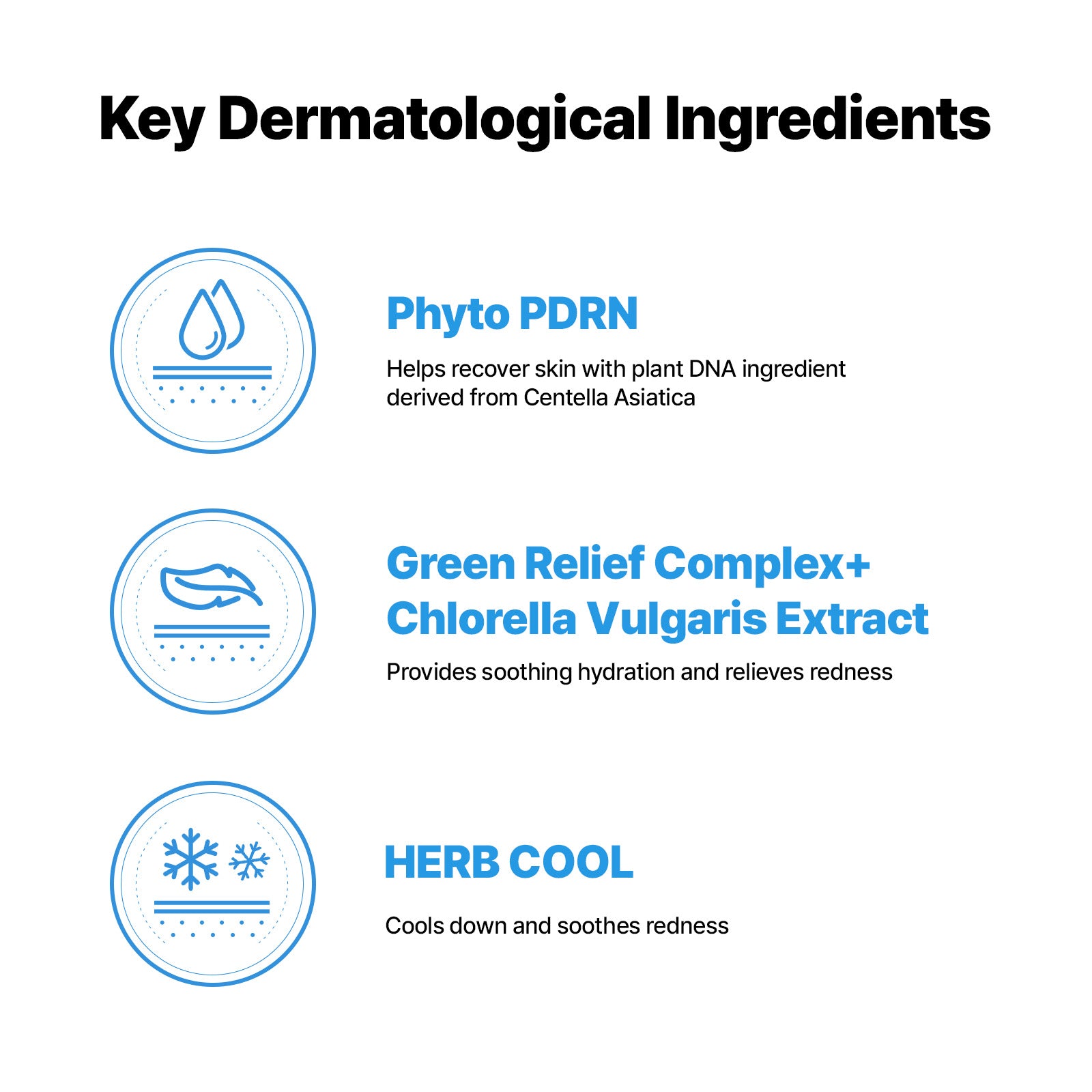 KEY INGREDIENTS Plant Based PDRN : To replenish skin with hydration Chlorella Extract & Green Relief Complex : To soothe inflamed skin HERB COOL : cooling raw ingredient from 3 plant derived extract : apple mint leaf, thyme leaf, green tea leaf)