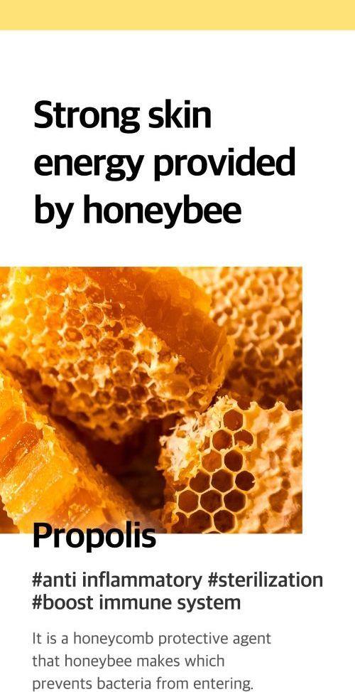 Propolis Extract(65%), Honey Extract, Dipropylene Glycol, Butylene Glycol, Hydroxyethyl Urea, Propanediol, Niacinamide, 1,2-Hexanediol, Centella Asiatica Extract, Melaleuca Alternifolia (Tea Tree) Leaf Water, Honey, Panthenol(5,000 ppm), Royal Jelly Extract, Artemisia Princeps Leaf Extract, Centella Asiatica Leaf Extract, Pollen Extract, Malt Extract, Glycerin, Sodium Hyaluronate, Allantoin, Adenosine, Madecassoside, Madecassic Acid, Asiaticoside, Asiatic Acid, Ceramide NP, Citric Acid, Sodium Citrate, C12-13 Pareth-9, Sodium Polyacrylate, Water, Benzyl Glycol, Ethylhexylglycerin, Raspberry Ketone, Disodium EDTA, Fragrance, Benzyl Alcohol, Coumarin