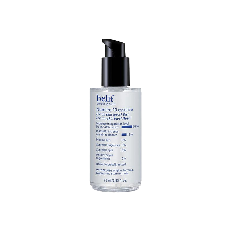 Belif Numero 10 essence is a hydrating 'first essence', designed to maintain moisture levels on the skin, since moisture evaporates from the skin within 10 seconds after cleansing! It's a toner + serum in one with a lightweight gel texture that helps retain the hydration in the skin before it can evaporate. Formulated with Rose of Jericho extract, that locks in the moisture and increases skin hydration level in 10 seconds. It is completely non-sticky and will keep the skin well hydrated while boosting the effects of the following products you apply.
