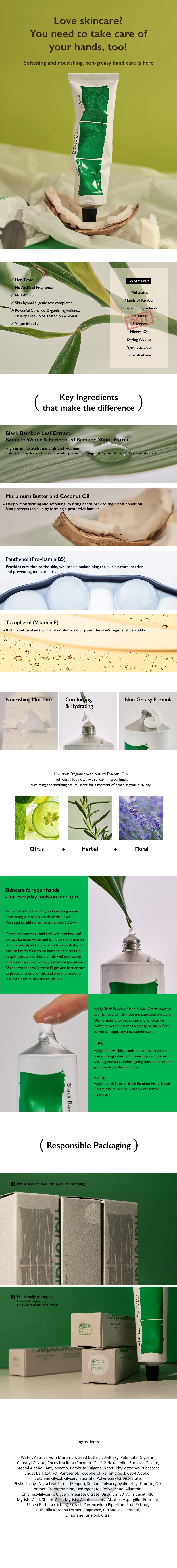 Black Bamboo Leaf Extract, Bamboo Water & Fermented Bamboo Shoot Extract : High in amino acids, minerals and vitamins. Calms and hydrates the skin, whilst providing long-lasting moisture adn skin portection. Murumuru Butter and Coconut Oil : Deeply moisturizing and softening, to bring hands back to their best condition. Also protects the skin by forming a prtective barrier. Panthenol (Provitamin B5) : Provides nutrition to the skin, whilst also maintaining the skin's natural barrier, and preventing moisture loss. Tocopherol(Vitamin E) : Rich in antioxidants to maintain skin elasticity and the skin's regenerative ability.