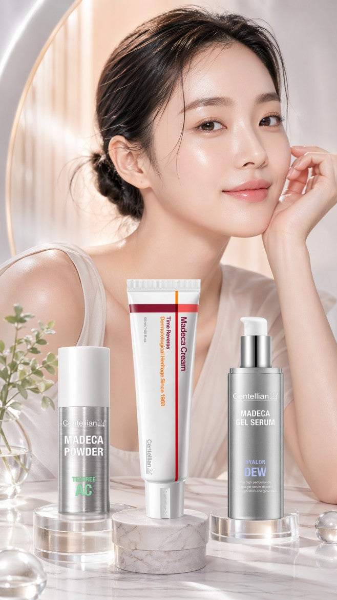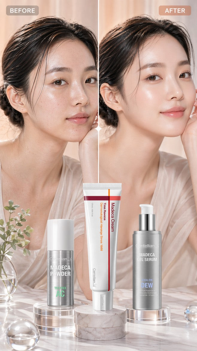 This bundle supports hydration, oil control, pore care, and barrier comfort in one practical routine. The Madeca Gel Serum Hyalron Dew helps coat the skin with lightweight moisture and contains niacinamide, Centella asiatica-derived components, and hydrolyzed hyaluronic acid. The Madeca Powder Tea Tree AC is designed for visible trouble areas, excess oil, and pore-focused care with tea tree leaf oil, salicylic acid, allantoin, niacinamide, and Centella-related ingredients. The Madeca Cream Time Reverse Season 7 adds a rich final step with Centella asiatica-derived care, niacinamide, adenosine, hyaluronic acid, ceramide NP, and retinol to support the appearance of smoother, firmer-looking skin.