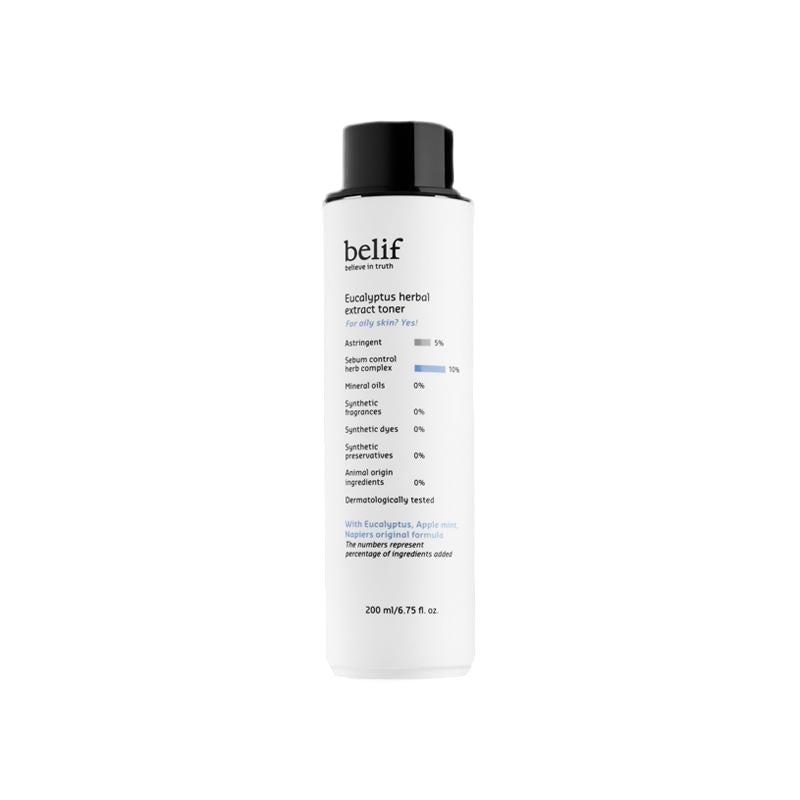 belif Eucalyptus herbal extract toner is a botanical toner designed to hydrate and balance normal to oily skin. It provides deep moisturization to the skin post cleansing, while controlling oil production without any greasiness. It's formulated with eucalyptus and apple mint that work to soothe, balance and hydrate the skin so it appears more supple and revitalized over time.