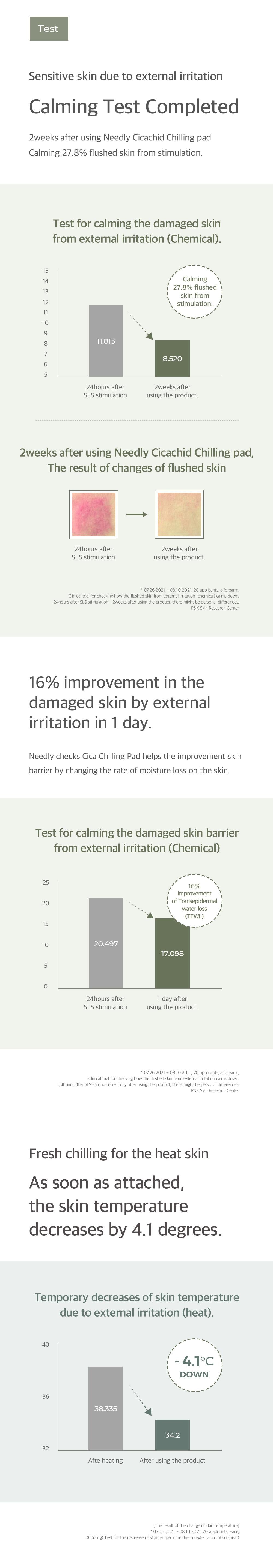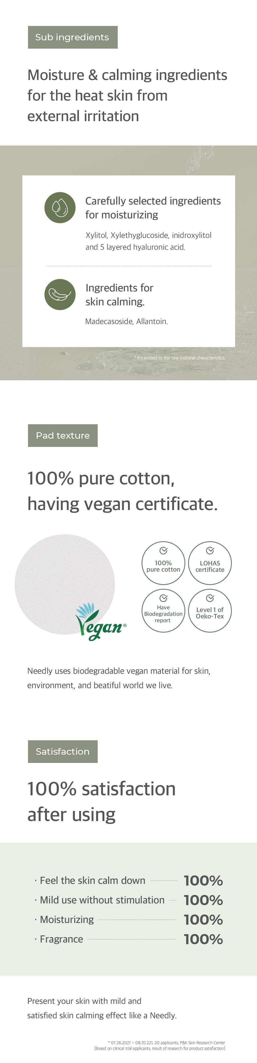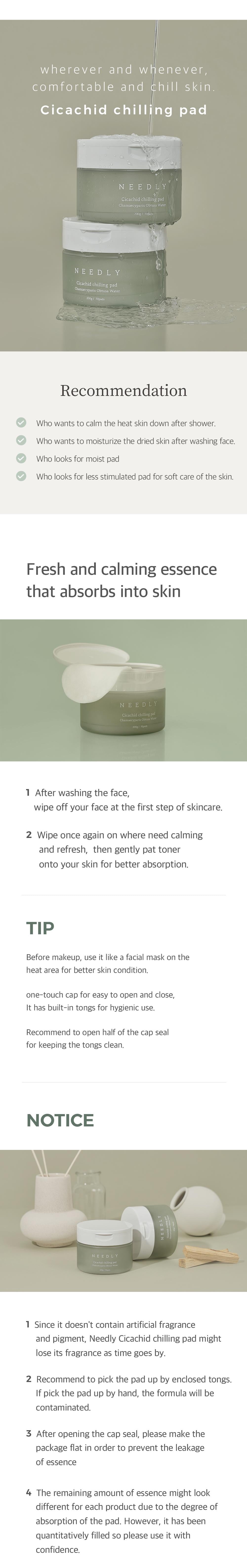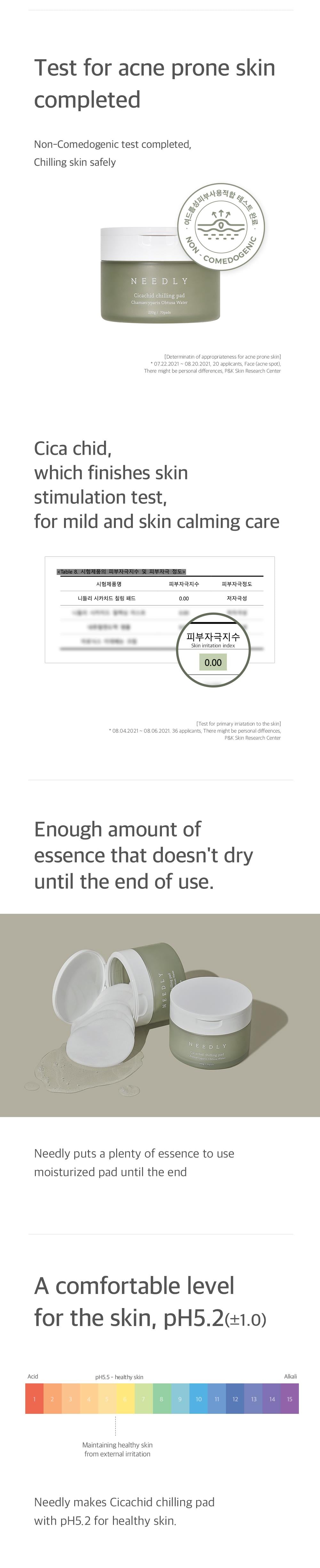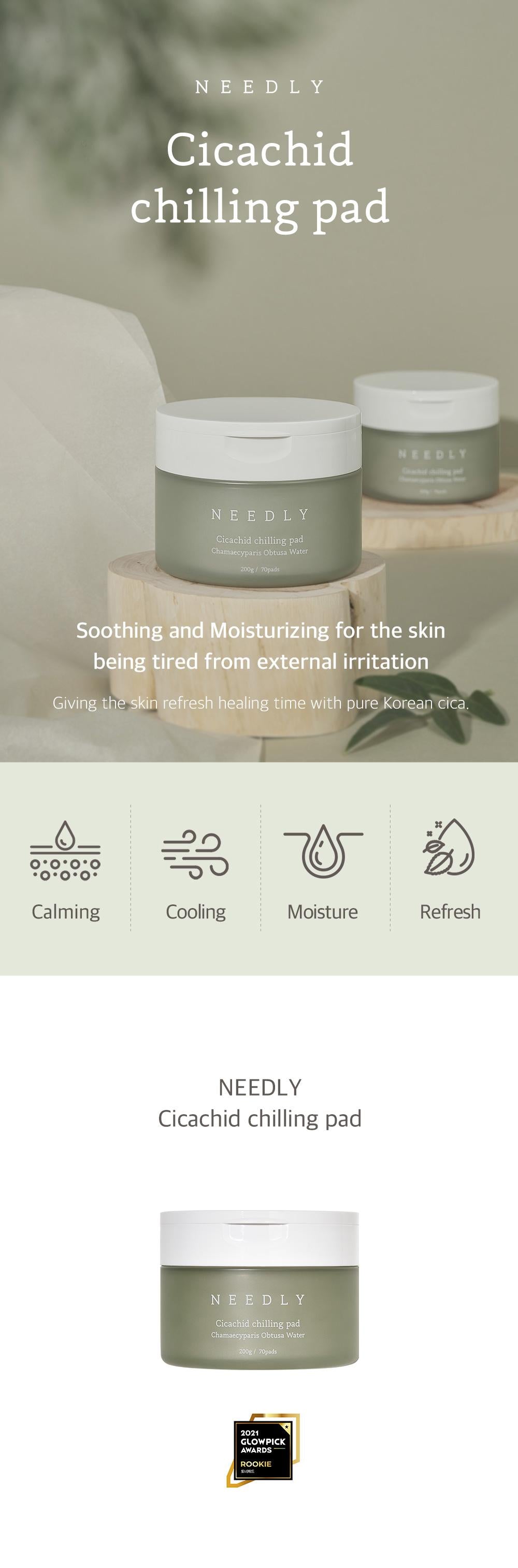NEEDLY Cicachid Chilling Pad -It is a pad that moisturizes the skin tired from external stimulation. -This is a daily soothing toner pad that moisturizes the heated skin. -It contains 850,000ppm of cypress water and 20,000ppm of Cicachid. NEEDLY Cicachid Chilling Pad POINT 01 It does not contain artificial fragrances and colors so that even sensitive skin can use it with confidence. POINT 02 Cypress, a natural raw material grown in the fresh air and cool breeze of nature, is full of phytoncides and flavonoids.