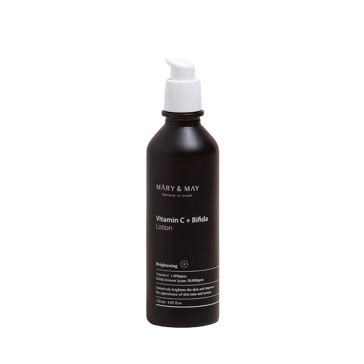 Mary&May Vitamin C + Bifida Lotion, 30,000ppm Bifida fermentation with 1,000ppm Vitamin C to brighten dull skin and moisturization 4.05 fl oz 1. A lotion enriched with probiotic bifida ferment lysate and vitamin C that works in synergy to protect the skin from environmental damage, revealing a firm and radiant skin. 2. Bifida ferment lysate replenishes nourishment for healthy glowy skin, strengthens the barrier to help skin regeneration and soften dead skin cells for a smooth complexion. 3. Infused with 1,000ppm vitamin C to inhibit melanin synthesis and reduce oxidized melanin, improving the appearance of dull skin and melasma. 4. Quickly absorbs into the skin that leaves a refreshing and moisturizing finish. 5. Formulated only with EWG green grade ingredients.