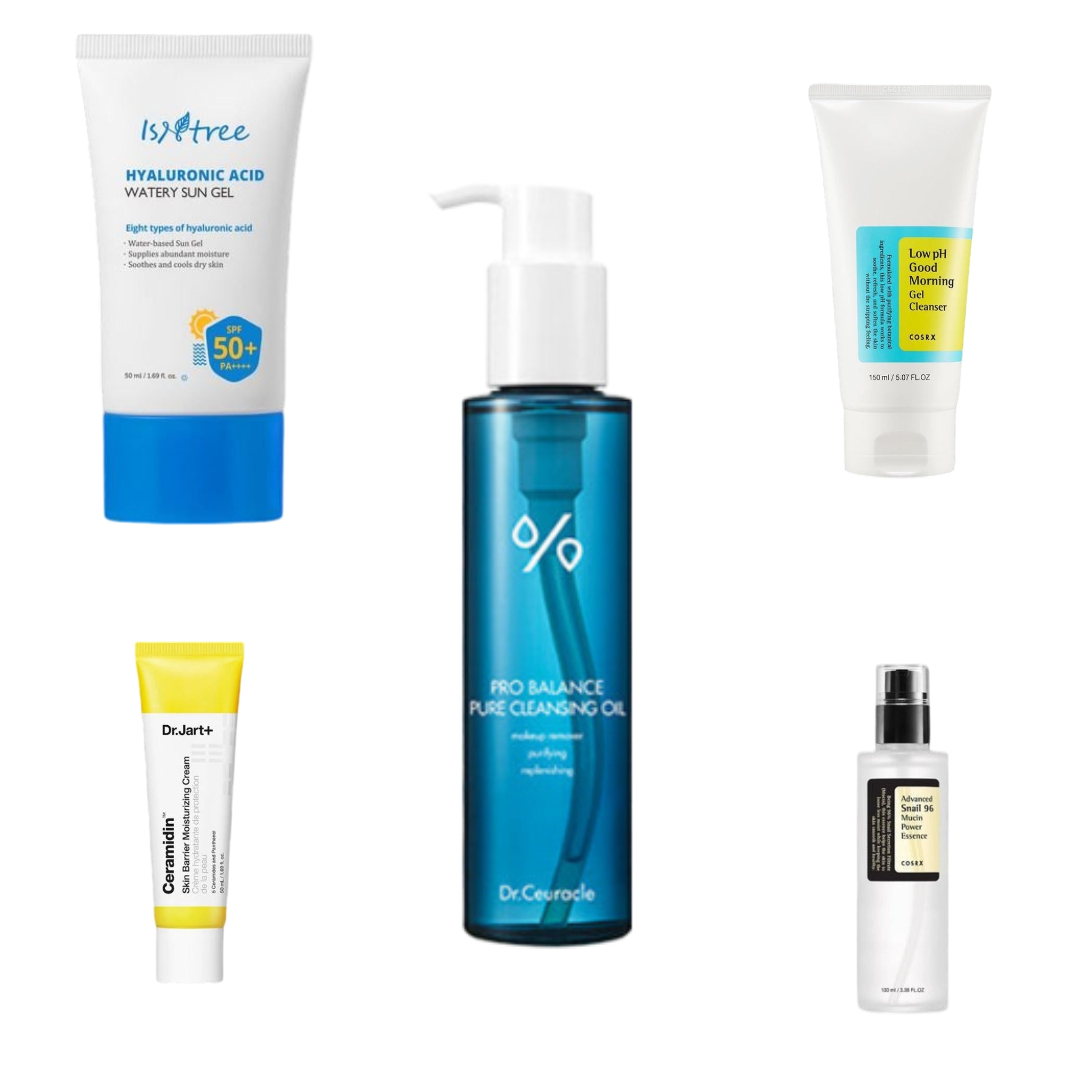 Korean Skincare Routine for Sun Damage and Protection Treatment in Age 50's for Tight and Dry Skin: Protect and repair sun damage with our Korean skincare treatment designed for those in their 50's with tight and dry skin. Cleanse with Dr.Ceuracle Pro Balance Pure Cleansing Oil, tone with Klairs Supple Preparation Unscented Toner, hydrate with Cosrx Advanced Snail 96 Mucin Power Essence, and moisturize with Dr.Jart+ Ceramidin Skin Barrier Moisturizing Cream. Finish off with Isntree Hyaluronic Acid Watery Sun Gel for lasting sun protection.