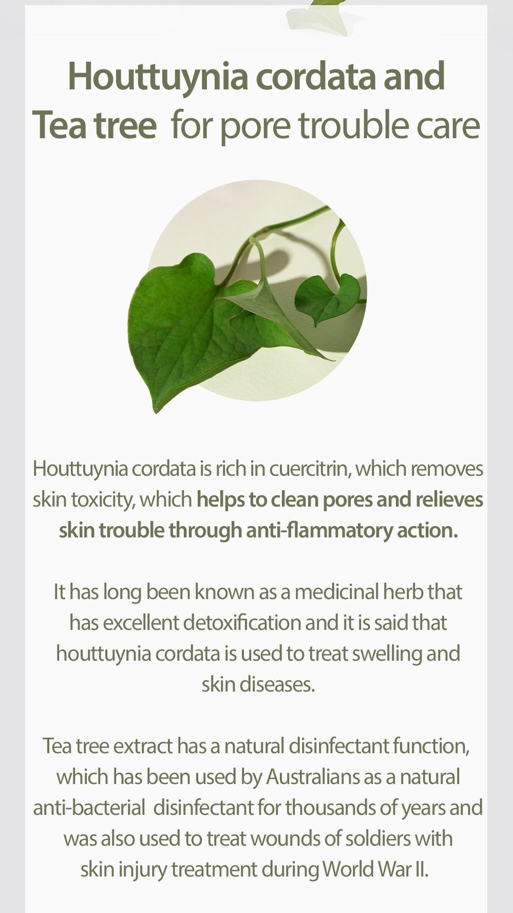 A soothing cream formulated with Houttuynia Cordata Extract and Tea Tree Extract, delivering an instant calming and cooling effects to environmental irritated skin. Enriched with 71.8% Houttuynia Cordata Extract that has anti-inflammatory property to soothe troubled skin while refines the appearance of pores. Contains 9.7% Tea Tree Extract with powerful antibiotic property to effectively heal wound. Contains Panthenol and 6 kinds of hyaluronic acids that act as humectants to hydrate and moisturize skin from within and prevent natural water loss. Free from animal testing and 16 harmful ingredients: paraben, artificial fragrance and colors, alcohol, mineral oil, surfactants and allergens.