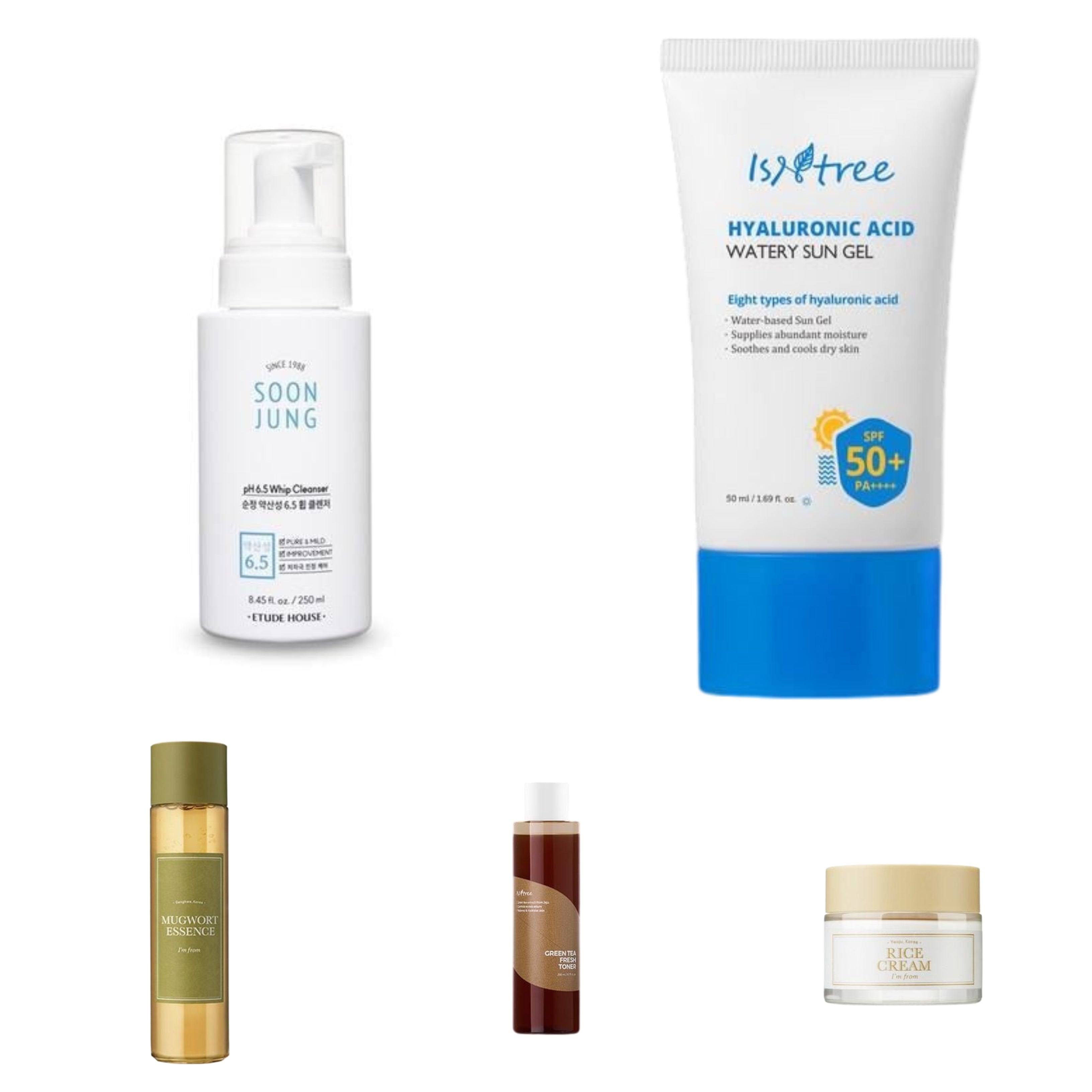Combat hormonal acne and nourish your skin with our Korean Skincare Treatment. [Etude House] SoonJung pH 6.5 Whip Cleanser gently cleanses while maintaining a healthy pH level. [Isntree] Green Tea Fresh Toner provides hydration and calms inflammation. [ImFrom] Mugwort Essence soothes and reduces redness, while [ImFrom] Rice Cream moisturizes and brightens. Complete your regimen with [Isntree] Hyaluronic Acid Watery Sun Gel for sun protection.