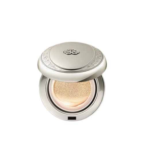 Highly moisturizing cushion foundation with royal White Ginseng (Panax Ginseng Root Extract) and Pearl Extract for skin tone evening with hydration benefits. Features comprehensive Korean herbal complex including traditional botanicals and Niacinamide for brightening effects while providing coverage. Contains Adenosine for anti-aging benefits and multiple herbal extracts for skin nourishment during makeup wear.