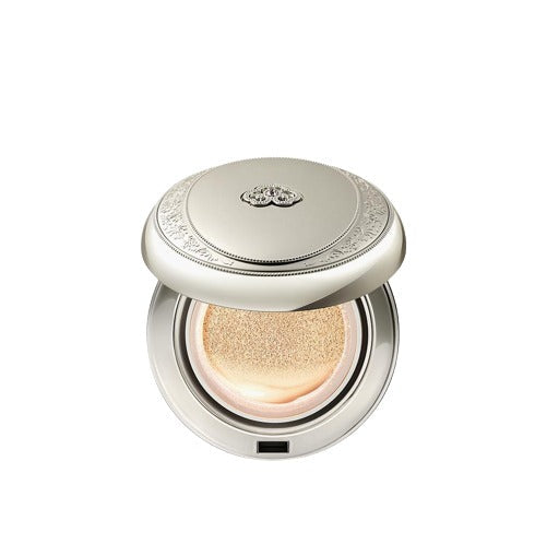 Highly moisturizing cushion foundation with royal White Ginseng (Panax Ginseng Root Extract) and Pearl Extract for skin tone evening with hydration benefits. Features comprehensive Korean herbal complex including traditional botanicals and Niacinamide for brightening effects while providing coverage. Contains Adenosine for anti-aging benefits and multiple herbal extracts for skin nourishment during makeup wear.